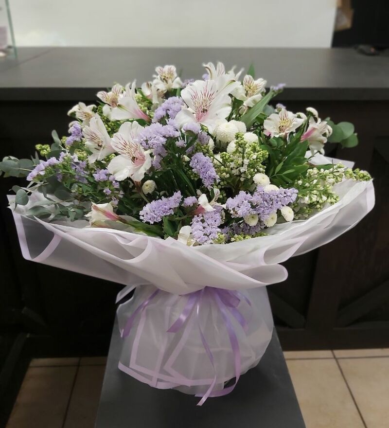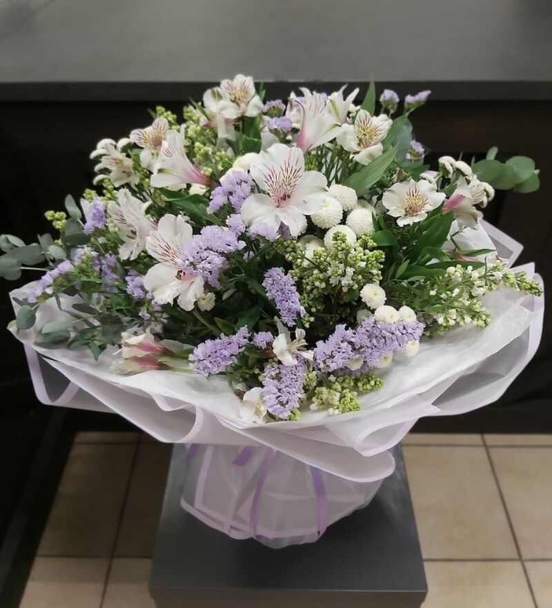 Пышный букет с основой из белых альстромерия, с добавлением сиреневого лимониума и хризантем, обрамленные упаковкой, подчеркивающей цветовую сердцевину букеты.