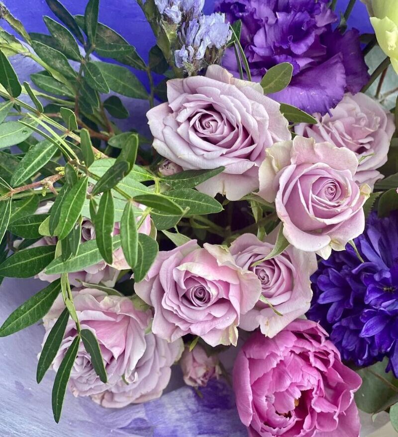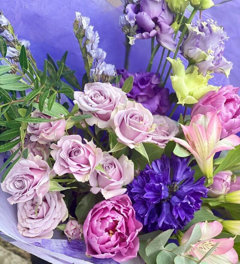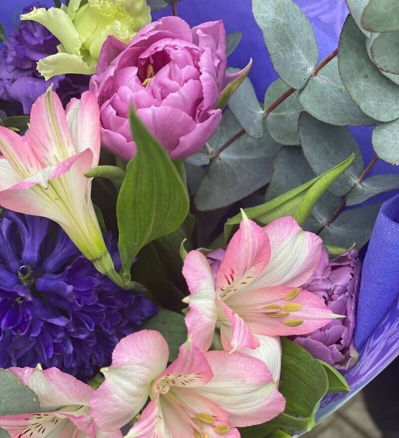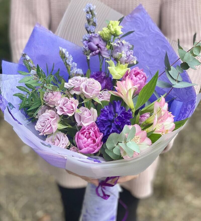Состав: Роза кустовая Силвер Мун, альстромерия, гиацинт, эустома Алисса, тюльпан пионовидный, старице, эвкалипт, фисташка.