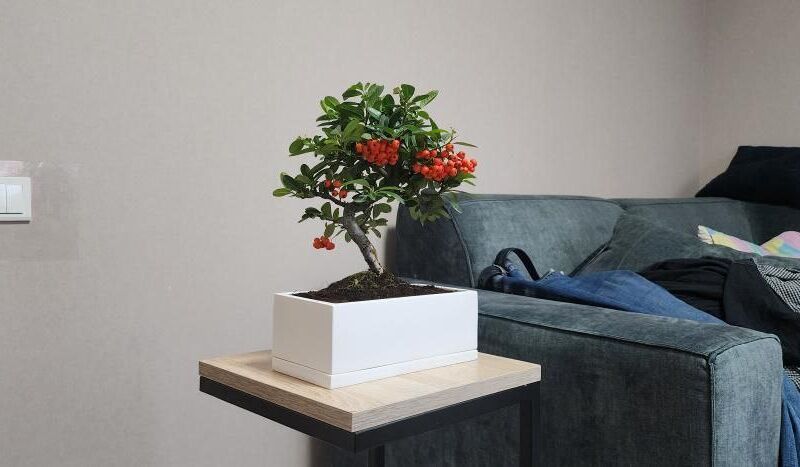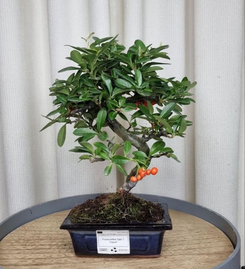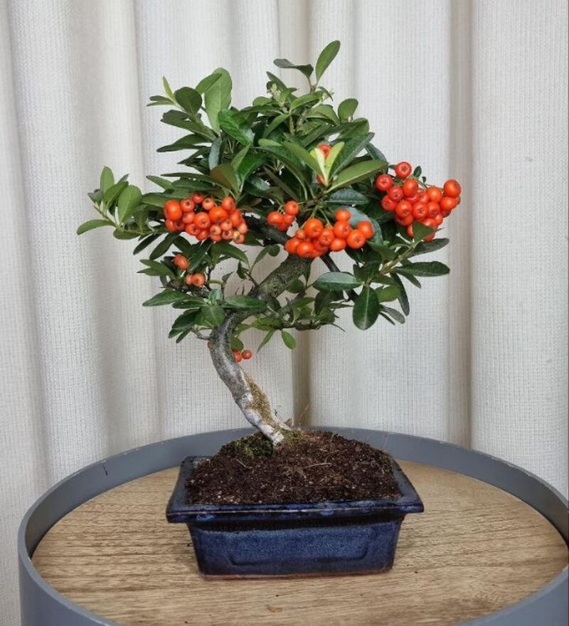 бонсай Пираканта (Огненный шип)- прекрасное вечнозеленое дерево, которое ценится за весенне-белое цветение и яркие плоды (красные, оранжевые, желтые).